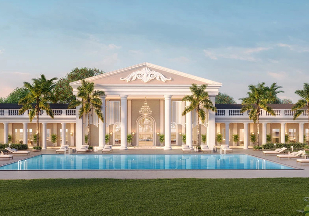 Grand clubhouse, swimming pool and landscaped green spaces.